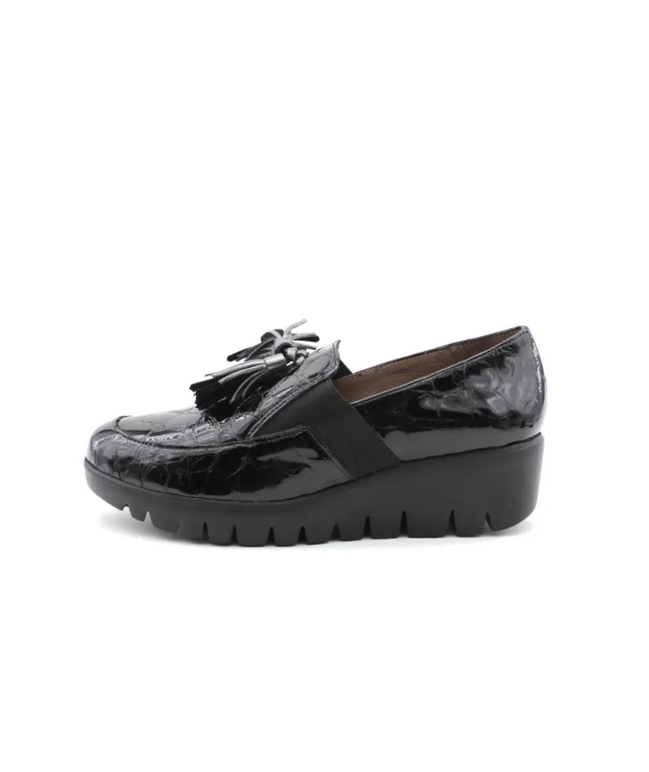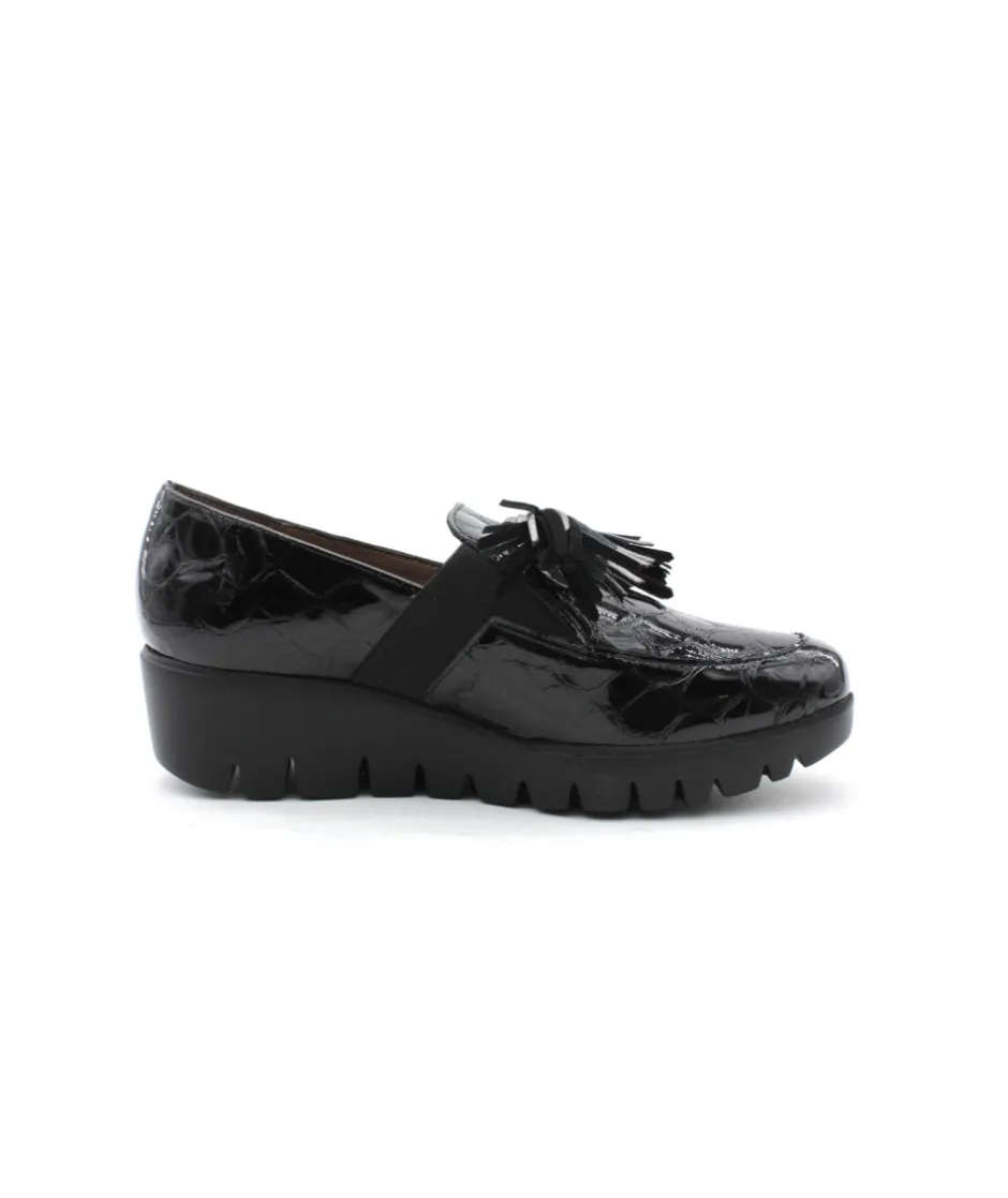 Joli mocassin en cuir vernis noir proposé par la maison espagnole Wonders. Le modèle C33254 casse les codes pour un look original et atypique, montée sur une semelle compensée, cette chaussure vous accompagnera partout grâce à son confort de marche. On aime les glands en cuir présent sur le plateau avant qui apporte de l’élégance au mocassin.
