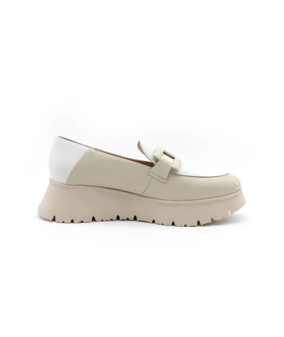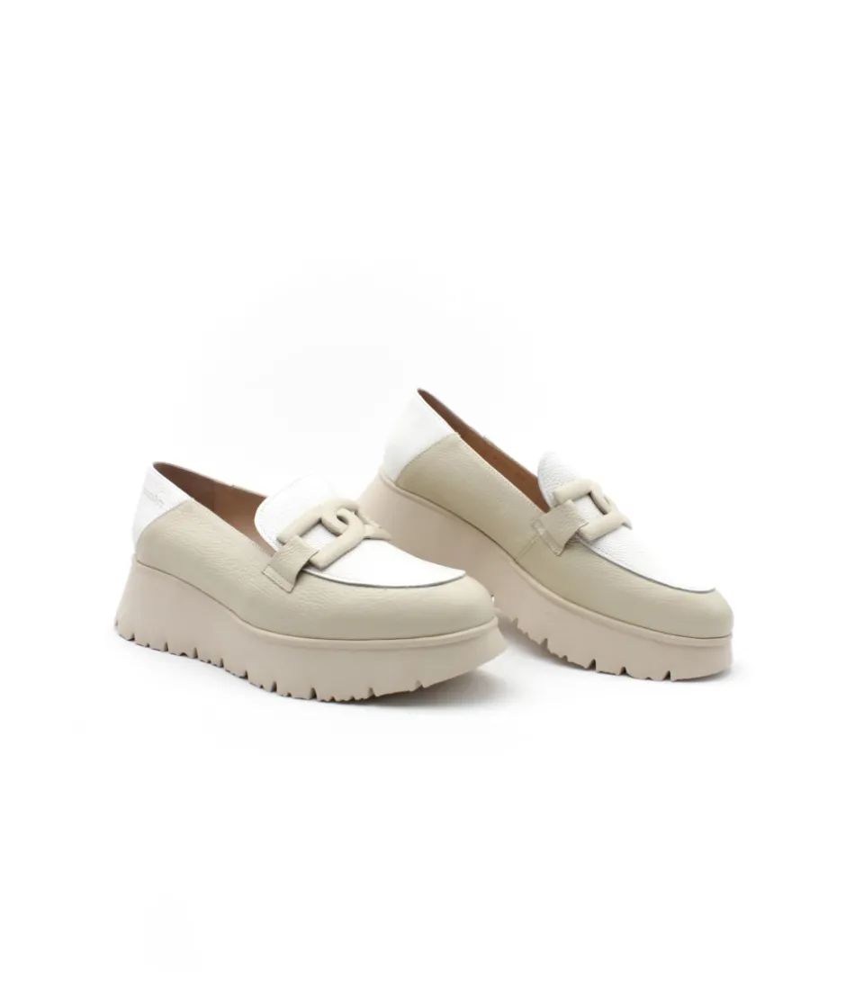 Joli mocassin en cuir bicolore crème et blanc proposé par la maison espagnole Wonders. Le modèle C7301, une forme bien connue de Wonders, casse les codes pour un look original et atypique, montée sur une semelle compensée, cette chaussure vous accompagnera partout grâce à son confort de marche. On aime le bijou tendance présent sur le plateau avant qui apporte de l’élégance au mocassin.