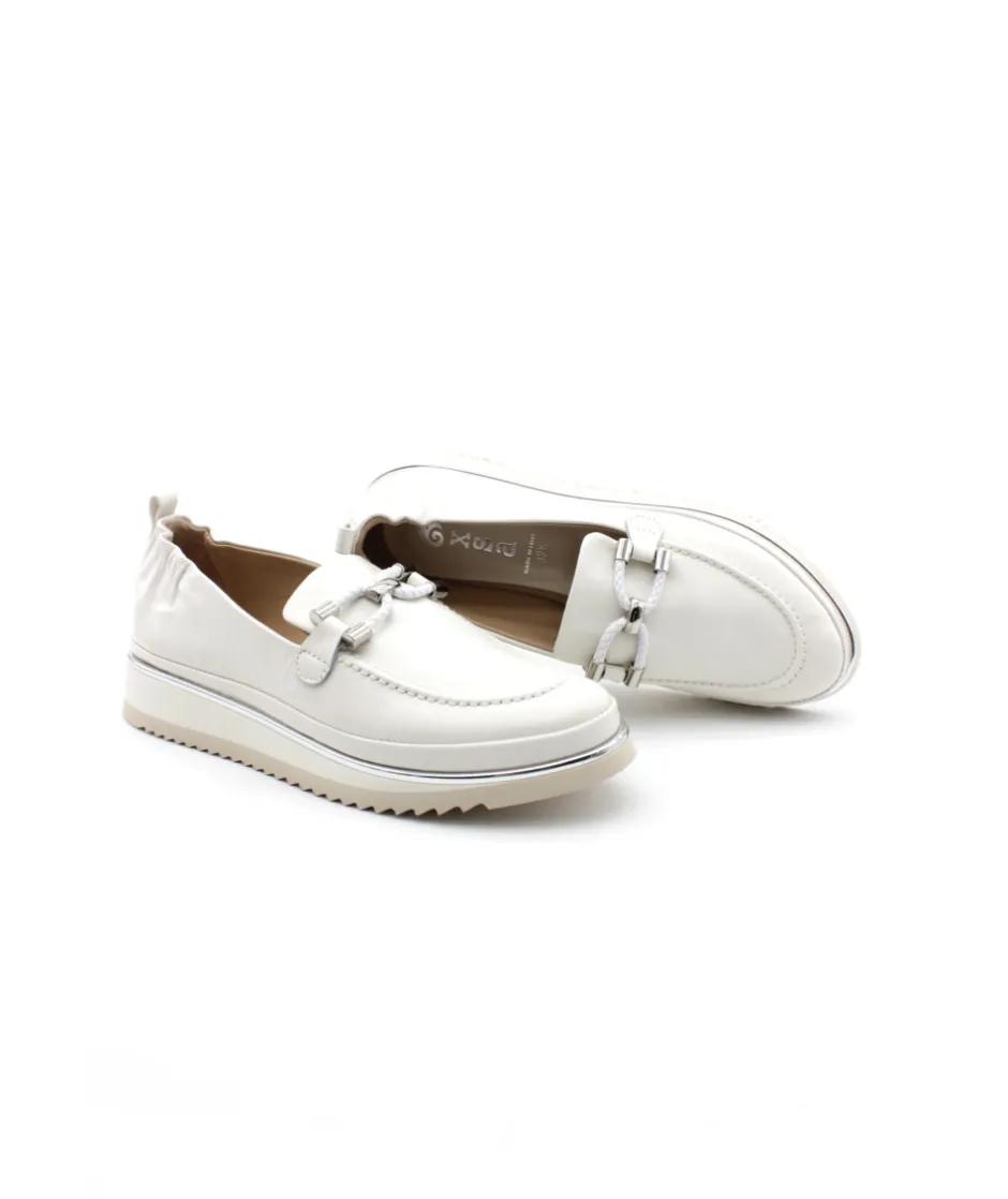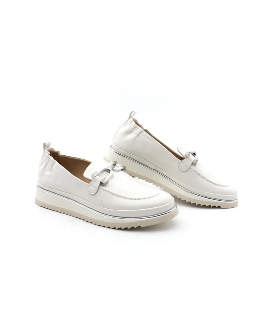 Magnifique mocassin à talon compensé de la maison Italienne XSA. Aussi élégant que le reste de la gamme, le nouveau modèle 9853 donne un nouveau look au mocassin en s’associant à une semelle compensée plus décontractée tout en conservant son apparence chic et féminin. Revêtu d’un cuir ivoire et d’un bijoux, cette chaussure pour femme deviendra rapidement la star de votre shoesing !