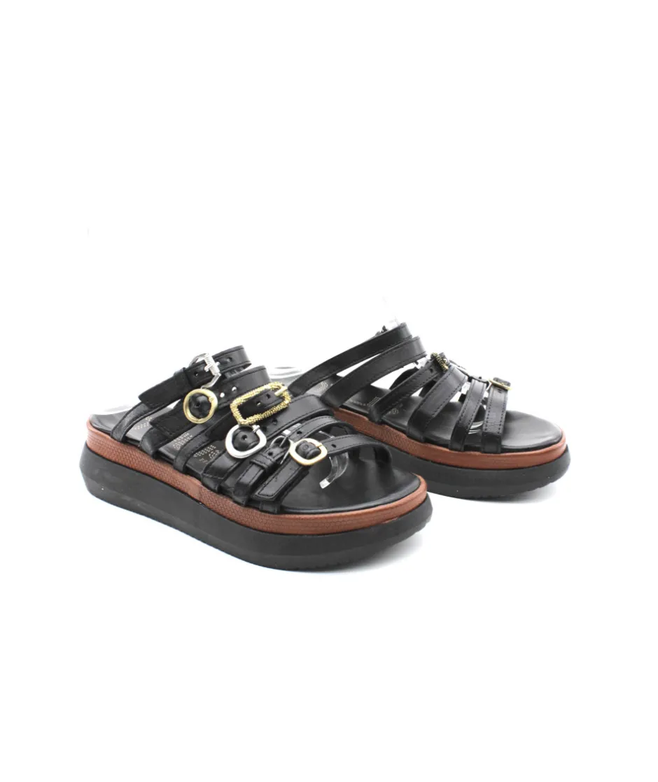 Mjus vous présente sa nouvelle mule à talon compensé version noir. Le modèle M38043 se monte sur un talon de 5 cm et des brides d’un cuir haut de gamme, très confortable pour votre pied. On aime son look spartiate accentué par ses nombreuses brides. Un modèle unique qui n’attends plus que vous.