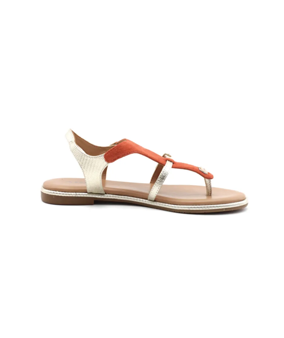 Jolie sandale plate moderne, élégante et féminine, voici les incontournables nu-pieds ANGEL-011 de la maison française ADIGE. Forte de ses compétences, la marque nous montre encore son savoir faire avec un design chic sur des cuir reliefs dorés, velours orange, ses brides réglables apporte quant-à elles un bon maintien du pied pour un confort à toutes épreuves. On aime la semelle gomme pour l’amorti.