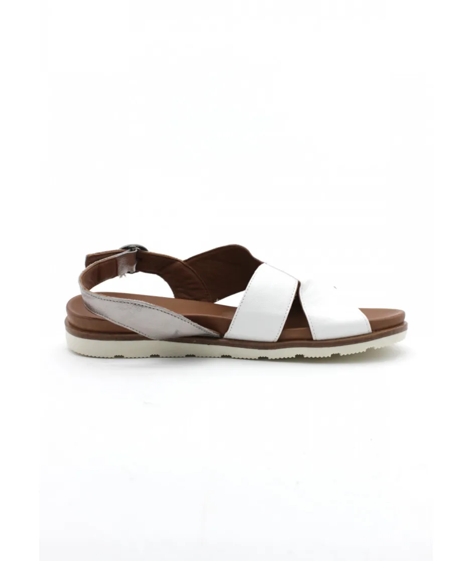 Nu-pieds en cuir BLANC ET CAMEL proposé par la marque Portugaise LUNE et L’AUTRE. Il s’ajuste par une bride à boucle sur l’arrière du pied. Une semelle caoutchouc blanche très confortable vient compléter cette sandale.