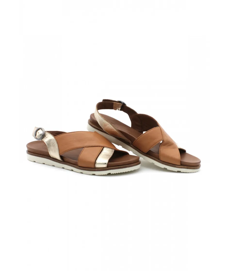 Nu-pieds en cuir BLANC ET CAMEL proposé par la marque Portugaise LUNE et L’AUTRE. Il s’ajuste par une bride à boucle sur l’arrière du pied. Une semelle caoutchouc blanche très confortable vient compléter cette sandale.