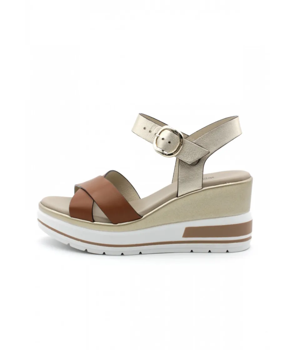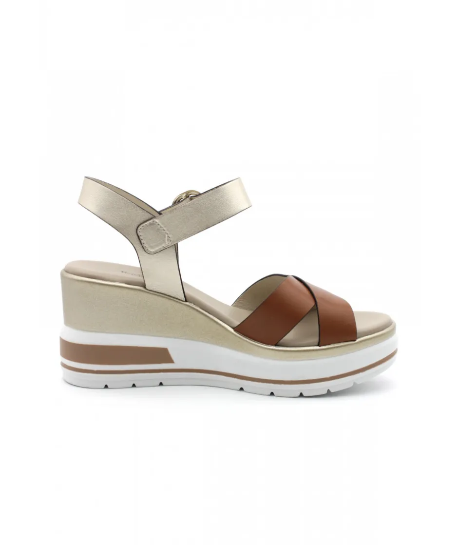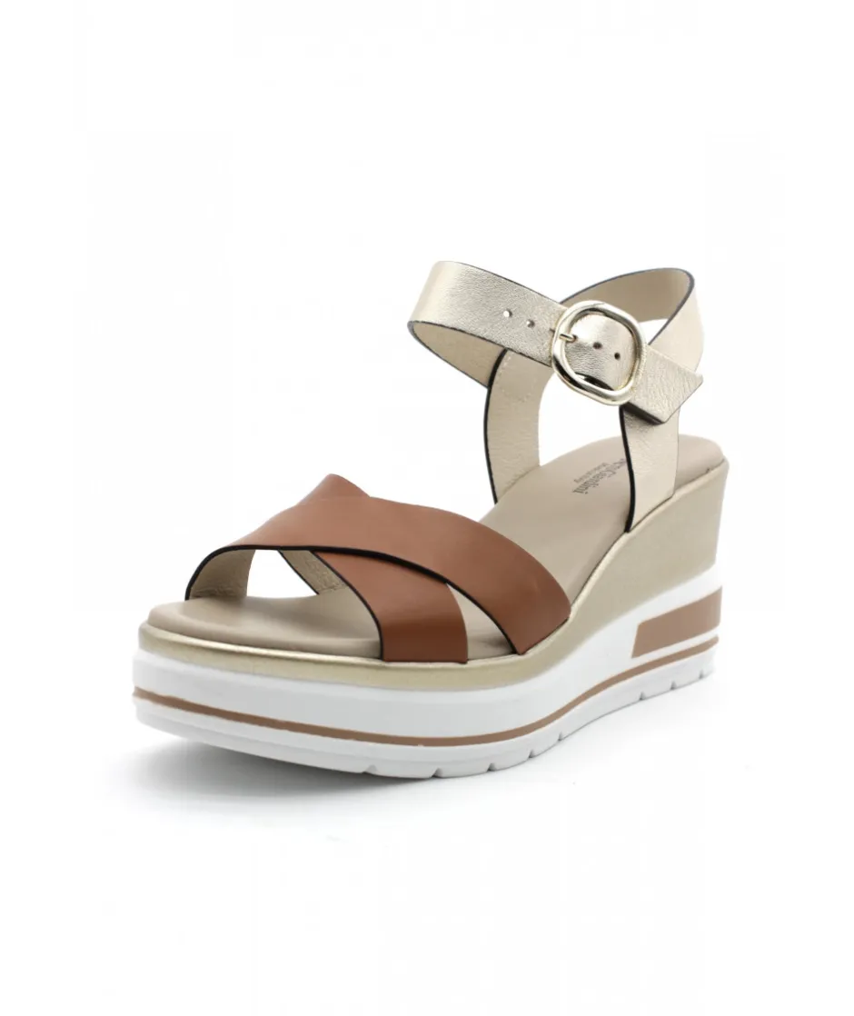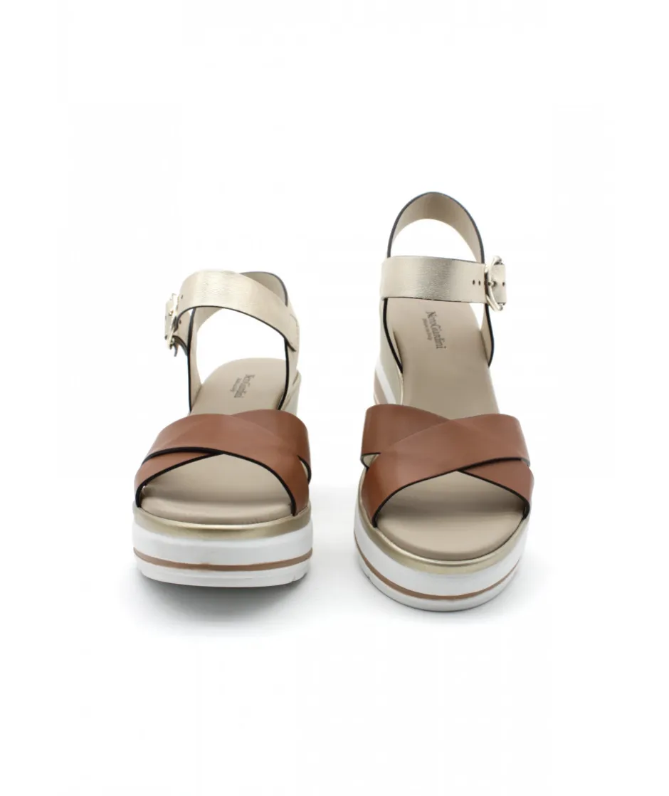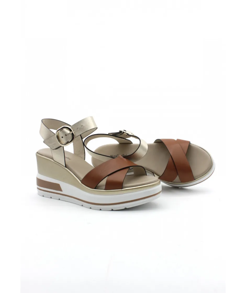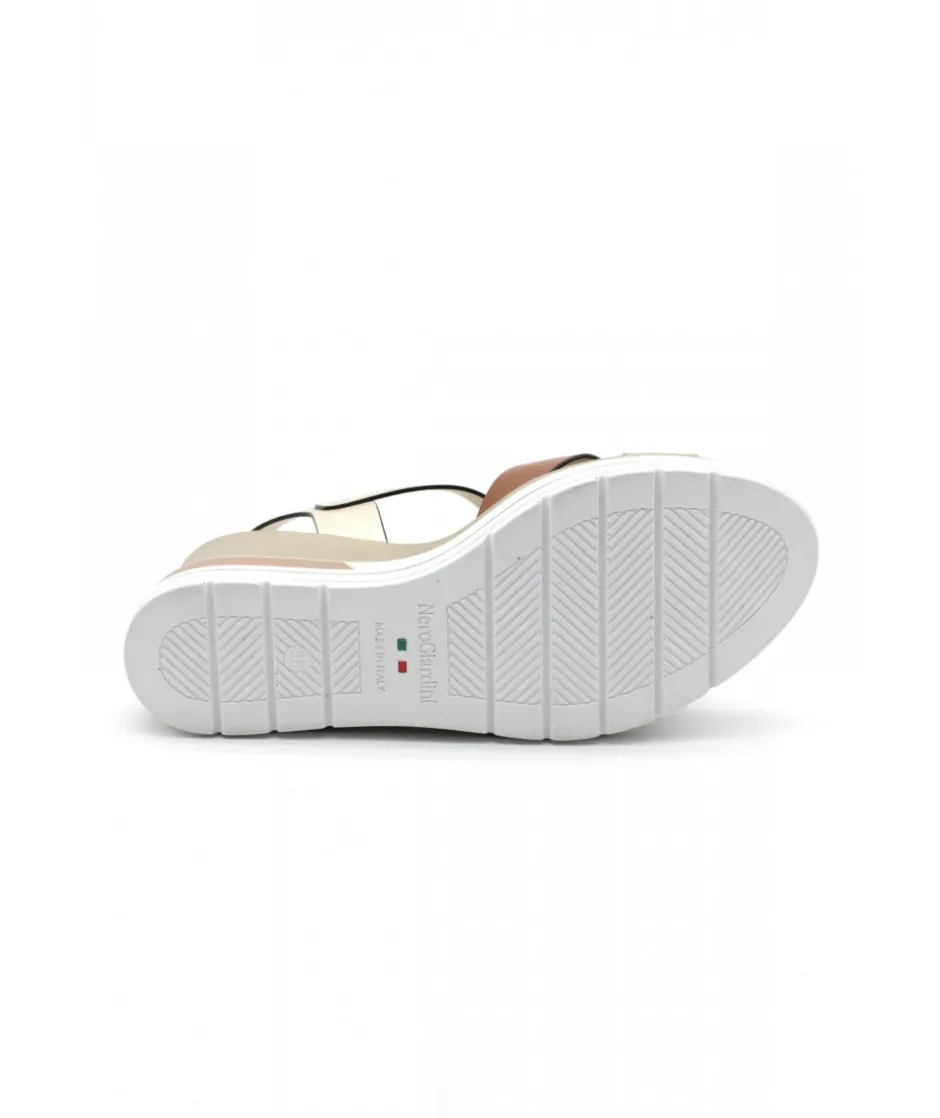 À la recherche d’une sandale compensée élégante, chic et tendance ? Voici la toute dernière 18737 de la maison italienne NEROGIARDINI dans son cuir cognac ou blanc. Sur un magnifique bloc compensé en gomme couleur blanc et or, ce nu-pied est le must-have de la saison estivale.