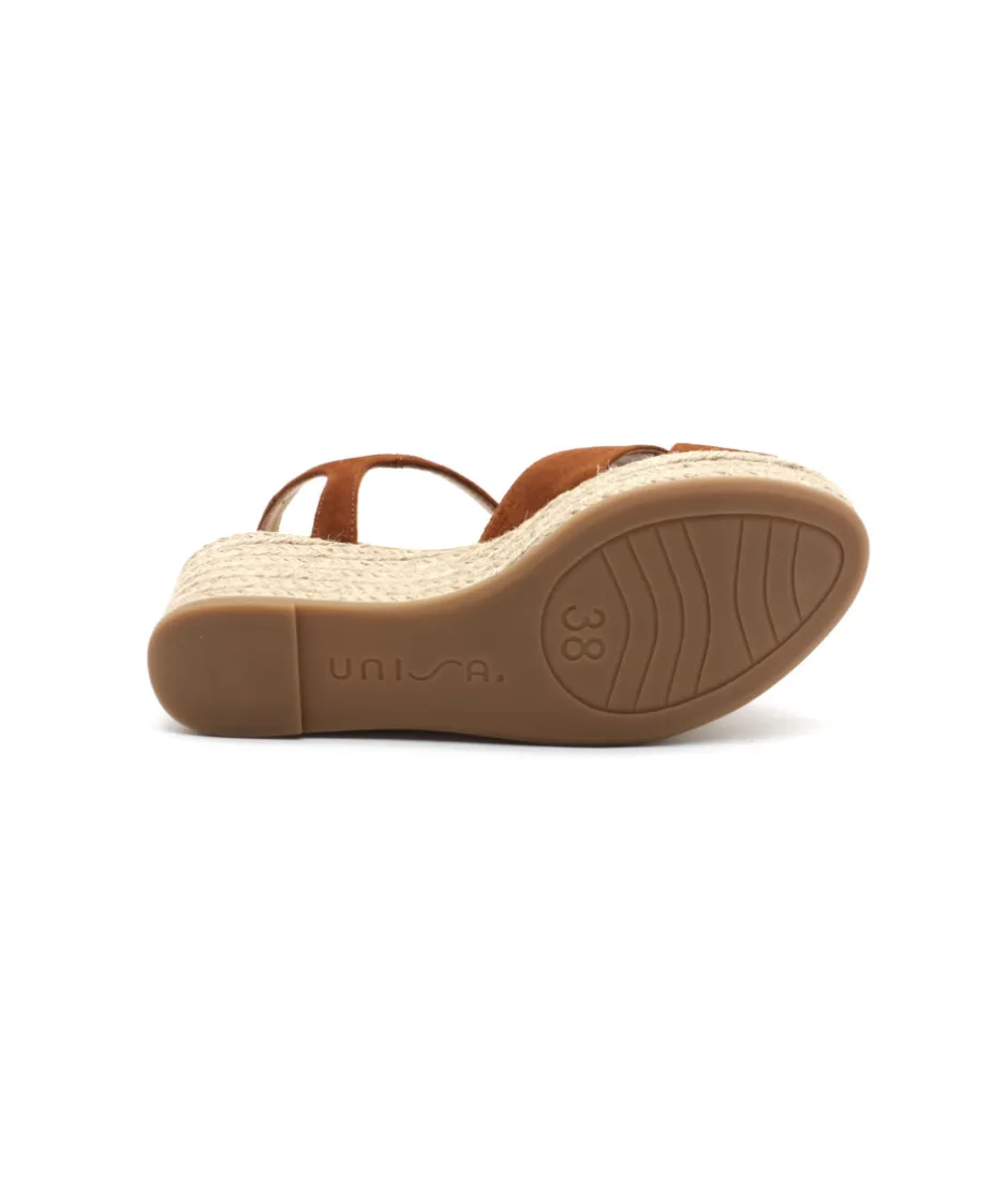 Jolie sandale sur la semelle légère et confortable de la maison espagnole UNISA. Le modèle KIRA se révèle dans un cuir velours marron ou taupe, des couleurs douces et tendances de cette année. Les brides avant croisées offre beaucoup d’élégance et de féminité à cette sandale confortable. On aime la semelle compensée en raphia crochet qui appuie le look décontracté et estival tandis que la bride cheville réglable maintien le pied au maximum.