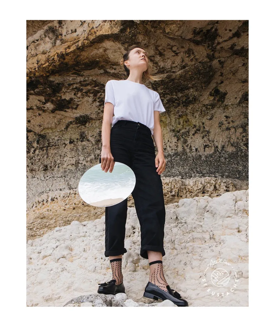 Crescent Dunes Black, un classique intemporel. Ce modèle sobre et élégant s’inspire des panneaux solaires traquant le soleil au cœur du Nevada. Une chaussette à pois noirs et blancs qui viennent épouser votre cheville en toute finesse. Pleine de chic, elle se portera à merveille avec des mocassins et une jupe ou un pantalon carotte noir.