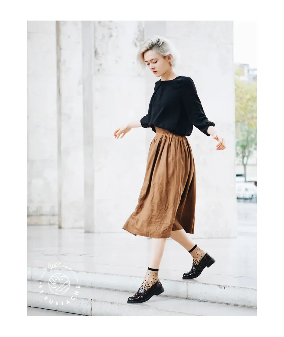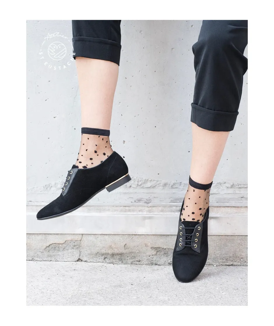 Dégradé de pois noirs sur un fond transparent : le classique plumetis revisité. Idéal autant avec des derbies qu’avec des mocassins ! Inspiré de l’envolée des pétales de cerisier sur le canal de Nakameguro.