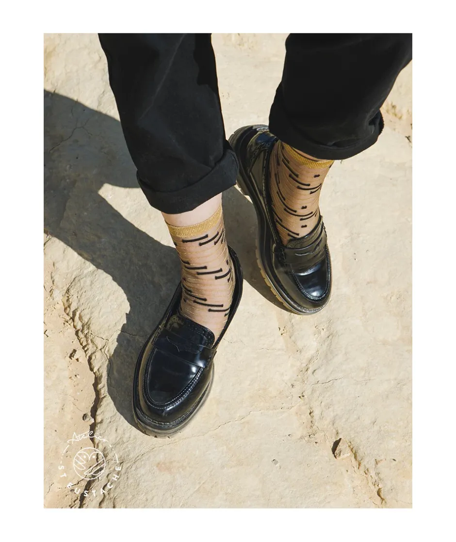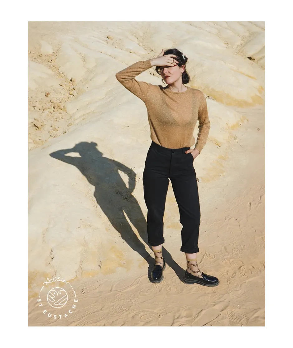 Shinjuku Gold. Les paillettes dorées étincelantes contrastées par un noir profond illumineront vos tenues ! Modèle inspiré du quartier vibrant de Shinjuku.