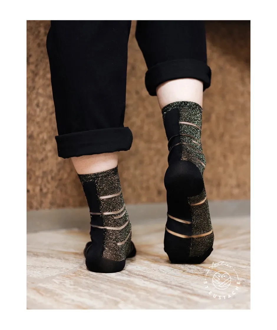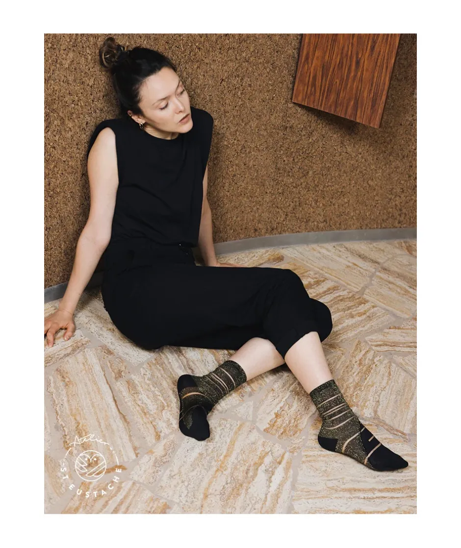 Rayées noires et dorées, ces chaussettes transparentes capteront tous les regards vers vos pieds. Une paire osée mais qui révélera au monde entier votre personnalité. Avec un total look noir, les Tate Modern Gold seront simplement sublimées. Modèle inspiré de la façade du musée Tate Modern.